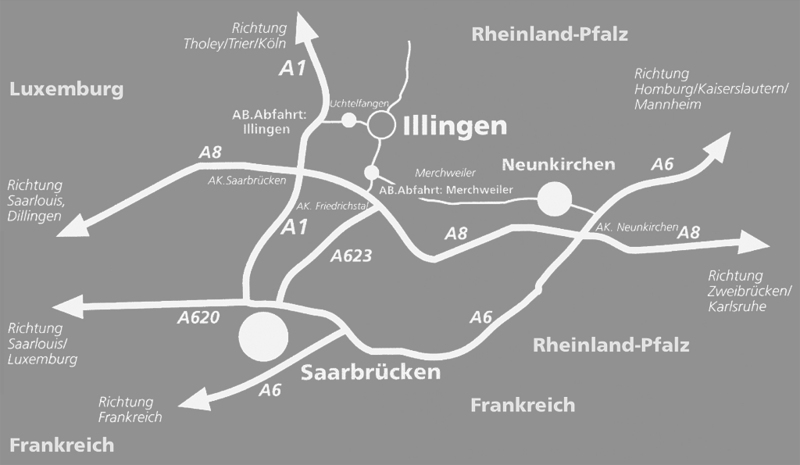 A8 bis Autobahnkreuz Saarbrücken, dann A1 Richtung Trier, Abfahrt Illingen-Uchtelfangen